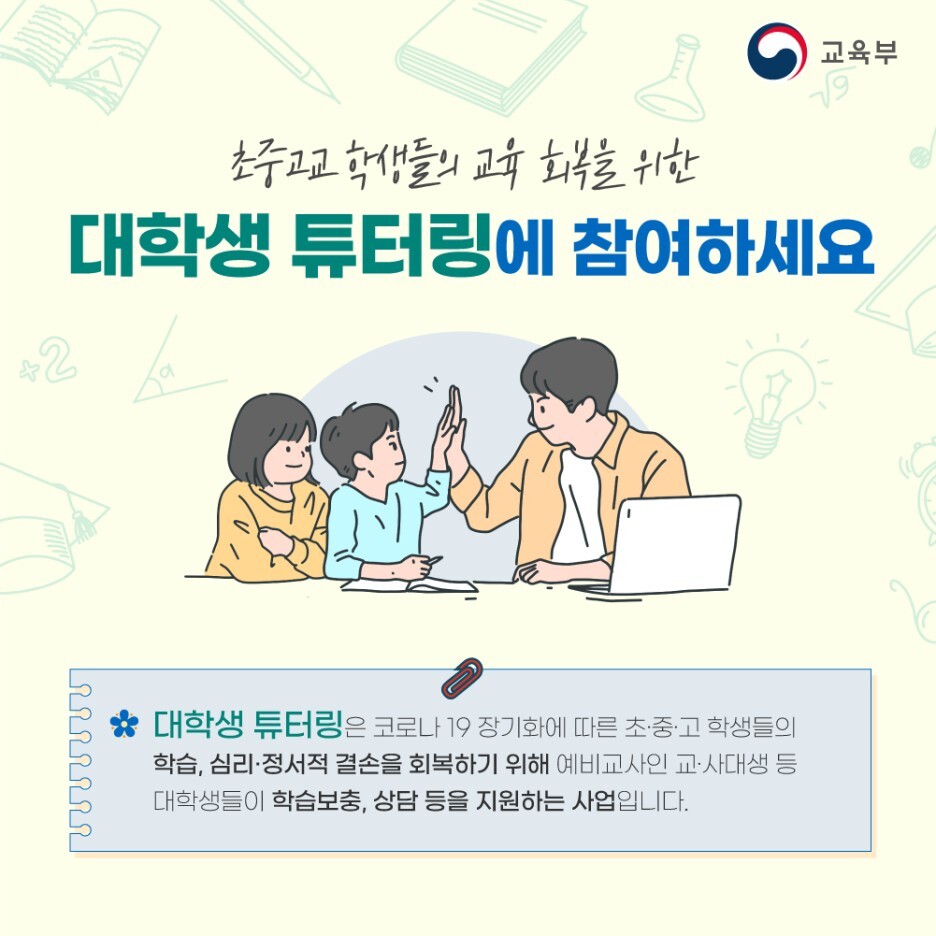 또한, 초·중·고 학생들의 학습 결손을 회복하기 위해 예비 교사 대학생들이 학습을 돕는 ‘대학생 튜터링’도 운영이 되고 있는데요. ‘대학생 튜터링’은 학습 결손을 회복하기 위한 학습보충뿐만이 아니라 교우관계 형성·신체활동 증진을 촉진하고, 학교단위 프로그램 운영을 지원하며, 다문화·장애학생·저소득층 학생 등을 지원합니다. 이 프로그램을 통해 학생들의 사회‧정서적 고립을 해소하고, 건강한 학습권을 보장하고자 노력하고 있습니다.