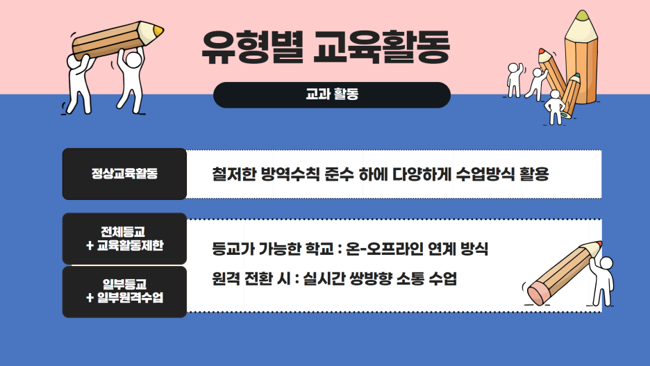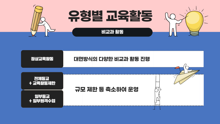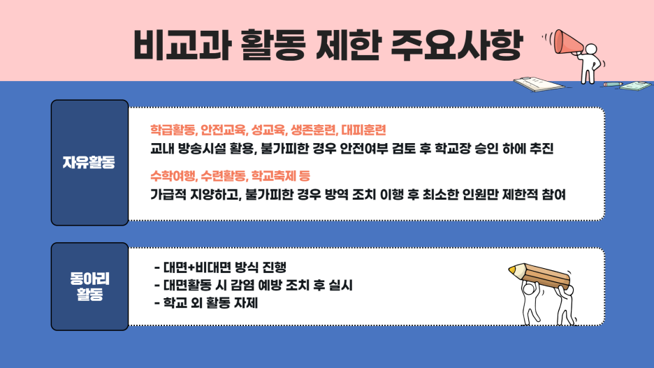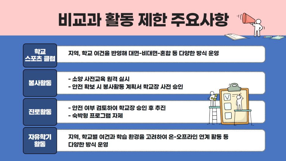 전체등교+교육활동 제한 및 일부등교+일부원격수업 운영 시에는 학생의 안전을 고려하여 비교과활동의 규모를 제한 및 축소하여 운영합니다.