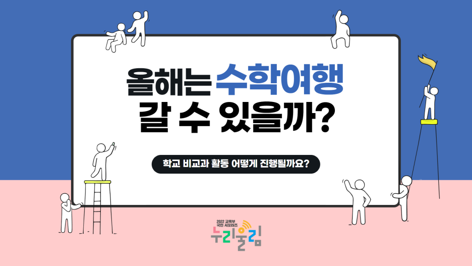 2022학년도 새 학기를 맞이하며 학교에서는 그리웠던 학생들의 목소리가 가득 울려 퍼지고 있습니다. 그리웠던 친구들, 선생님을 만나 기쁜 반면, 오미크론의 확산세가 좀처럼 잦아들지 않으면서 마음 한편으로는 불안감을 느끼기도 하는데요. 학생들은 ‘2022년 수학여행 갈 수 있을까요?’, ‘2022년 수학여행 갈 가능성이 있을까요??’라고 글을 올리는 등 학교 비교과 활동에 대한 기대감을 드러내기도 했는데요.