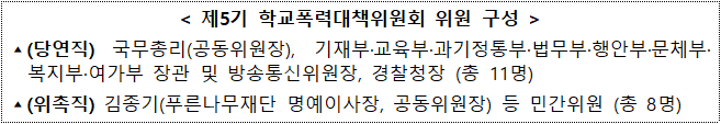 “학교폭력으로부터 안전한 사회환경을 만들기 위해서는 무엇보다도 범부처의 협력적인 노력이 필요한 만큼, 각 부처에서도 관심을 가지고 힘을 모아달라”고 밝혔습니다.