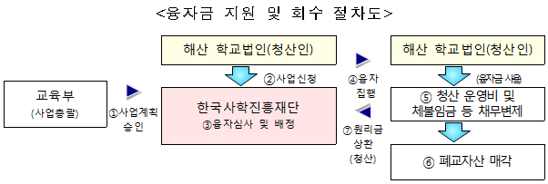 : 원활한 폐교 및 청산 지원(교직원 체불임금 등 채무 우선 변제를 위한 청산융자금 지원) |
