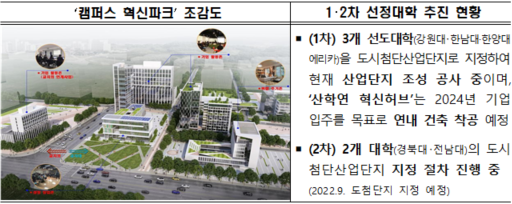 지난 2019년 5월 정부의「캠퍼스 혁신파크 조성방안」발표 이후, 2차례 공모(2019.8., 2021.4.)를 통해 총 5개 대학(1차 : 강원대, 한남대, 한양대 에리카, 2차 : 경북대, 전남대)을 사업 대상으로 선정하였으며, 도시첨단산업단지 지정, 착공 등 개발절차가 차질 없이 진행되고 있다.