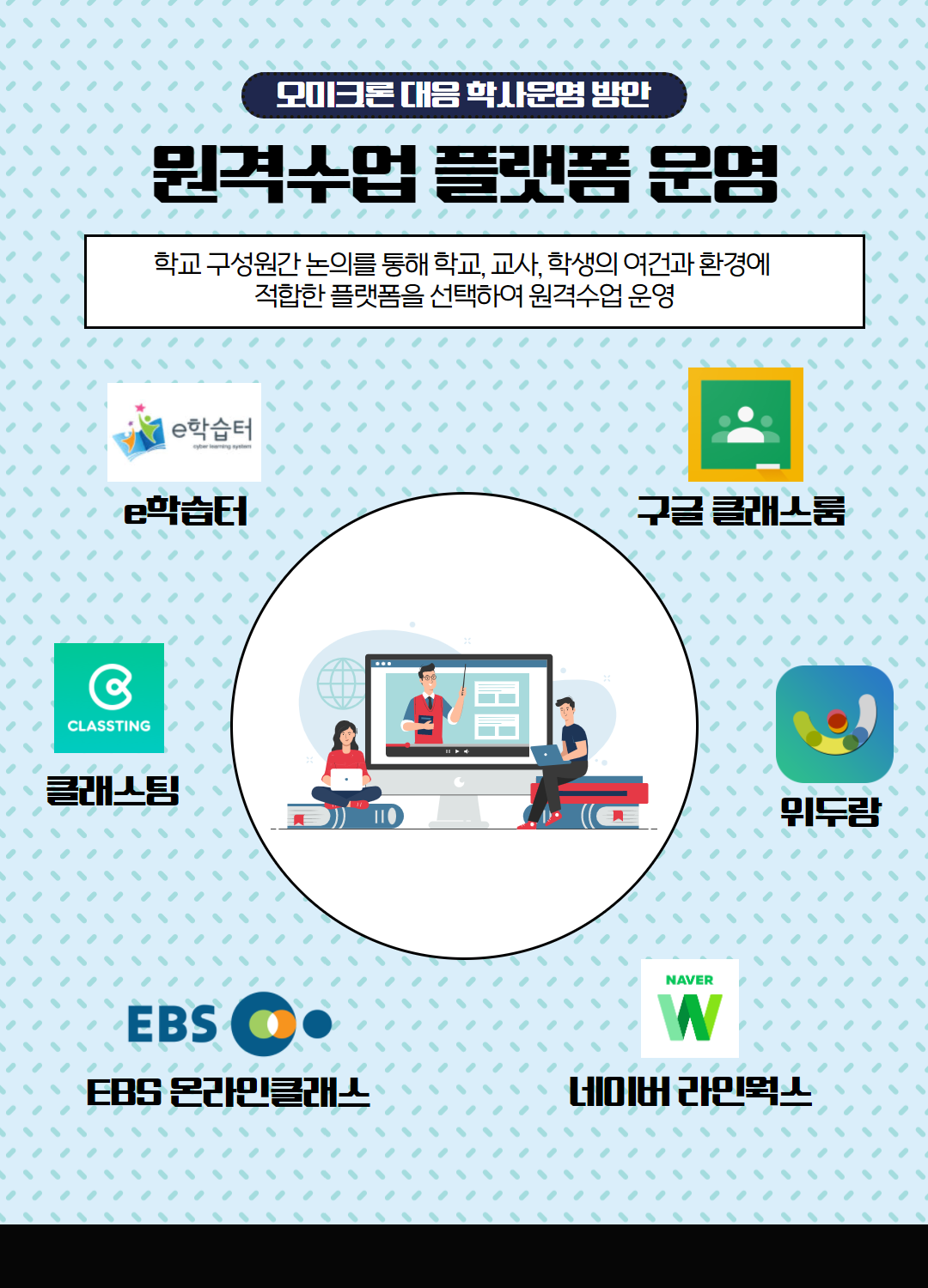 플랫폼은 이용 목적에 따라 학생들과의 소통은 SNS(카카오톡 등), 과제제시 및 관리는 e학습터·ebs온라인클래스를 활용하는 것과 같이 여러 개를 사용할 수 있으나, 학생들의 혼란을 줄이기 위해 학교별로 플랫폼 개수를 최소화하여 운영할 수 있도록 권장하고 있습니다.