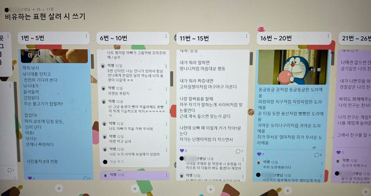 A. 제가 근무하고 있는 학교의 경우에는 담임 교사의 재량에 따라 대체학습을 제공하고 있어요. 물론 교실 수업을 동시에 송출하면 가장 좋긴 한데, 저는 플랫폼을 활용해서 학습 영상을 공유하고 과제를 제시하고 있습니다. 아침 수업 시작 시간에 맞춰 e학습터에 학습 영상을 공유하고, 클래스팅 어플을 활용하여 과제 혹은 학습지를 제공하며, 패들렛 사이트를 활용하여 온·오프라인 학생들이 서로의 과제에 대해 소통하도록 하고 있습니다.