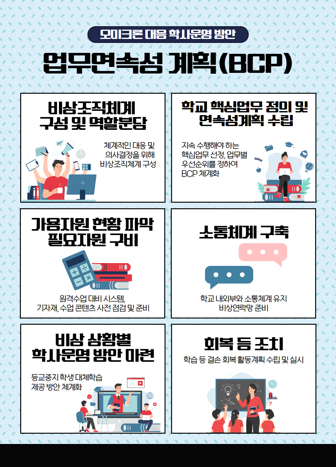 교육부에서 발표한 ‘오미크론 대응 2022학년도 1학기 방역 및 학사 운영방안’에는 오미크론 확산에 따라 발생하는 비상 상황에 대비하여 학교별로 업무 연속성 계획(BCP)을 세울 수 있도록 권고하고 있습니다.