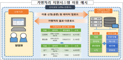 가명처리 지원시스템은 개인정보가 포함된 데이터를 비식별조치(가명·익명처리)한 가명정보로 변환하여 제공하며,