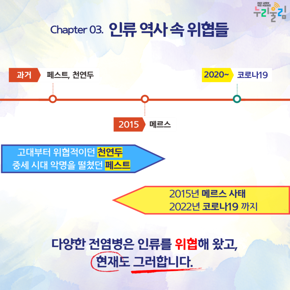 앞서 언급한 점 외에, 역사 속 사례들을 통해서도 보건 교육의 중요성을 알 수 있습니다. 지금까지 인간은 여러 질병에 시달리면서, 또 이겨내면서 살아왔습니다. 멀게는 중세 유럽을 공포에 몰아넣었던 페스트와, 고대부터 위협적이었다는 기록이 있는 천연두가 있습니다. 가깝게는 지난 2015년 ‘낙타’를 기피 동물로 만들었던 메르스 사태, 2022년 현재도 전 세계를 마스크 속에서 벗어나지 못하게 하고 있는 코로나19가 있습니다.