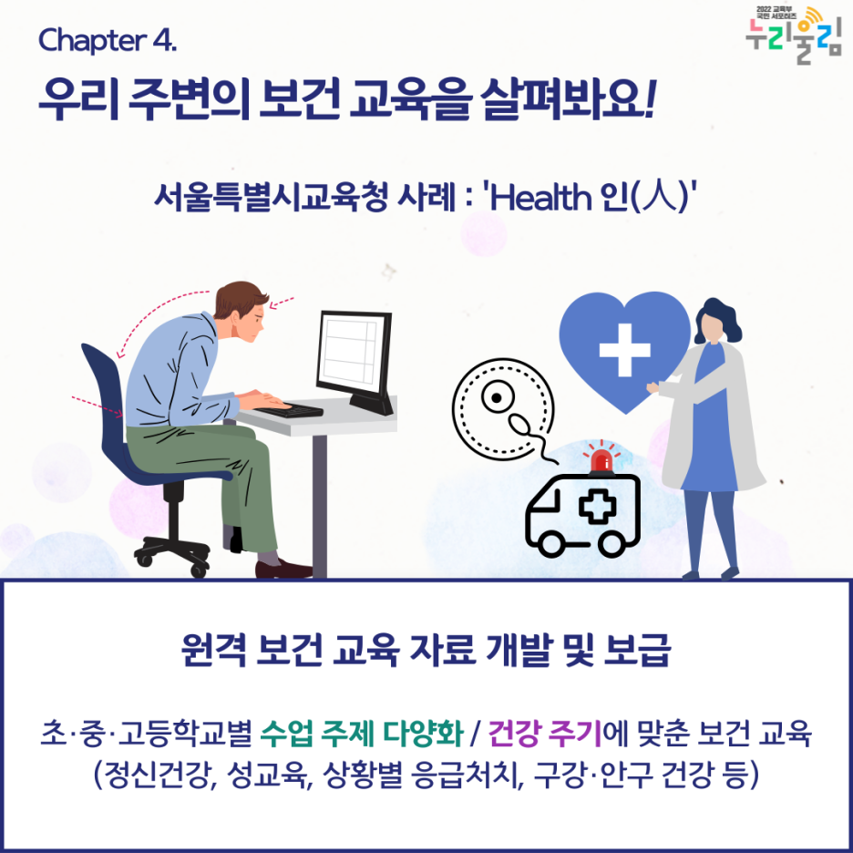이러한 배경에서 개발된 ‘Health인(人)’ 원격 보건 교육 자료는 학교급별로 수업 주제를 다양화하여 학생들이 각각의 연령대에 따라 보건 교육을 받을 수 있도록 구성되었습니다. Health인(人)의 내용에 따라, 초등학생은 코로나19 대응과 시민의식, 중학생은 건강권과 성적 권리, 고등학생은 일상 속 습관과 정신건강 증진을 핵심으로 보건 교육을 받을 수 있습니다. 또한, 구강·안구 건강 등 놓치기 쉬운 신체의 건강 지식과 상황별 응급처치 요령 등 실생활에 적용 가능한 실용적인 지식도 포함되어 있다고 합니다.