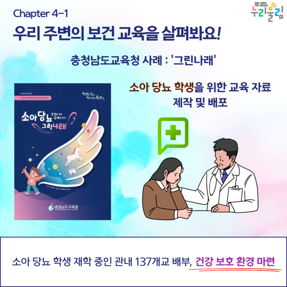 다음은 충청남도교육청의 사례를 보겠습니다. 바로 소아 당뇨 학생들을 위한 보건 교육 자료 제작·배포에 관한 이야기인데요. 충청남도교육청에서는 소아 당뇨 학생들이 생활 속 어려움과 마음의 짐을 덜 수 있도록 ‘그린나래’라는 이름의 소아 당뇨 보건 교육 자료를 제작했습니다.