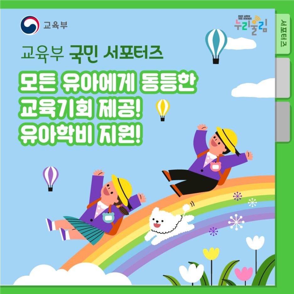 이렇게 실제로 지원사업의 혜택을 받고 있는 목소리도 들어보았는데요, 아이를 키우는 학부모들의 부담이 경감되고 경제적 여건에 따른 교육의 양극화 문제가 해소될 수 있기를 바랍니다. 앞으로도 이렇게 국민에게 도움이 되는 교육 정책들이 많이 나와서 모든 대한민국 국민이 걱정 없이 교육받을 수 있는 환경이 조성되었으면 좋겠습니다!