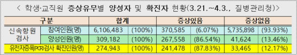 ** 3.21.~4.3.까지의 선제검사 결과를 질병관리청 확진자 정보와 연계‧분석한 결과, 확진자 27만 5천 명 중 유증상자는 24만 2천 명(87.8%), 무증상자는 3만 3천 명(12.2%)으로 확인