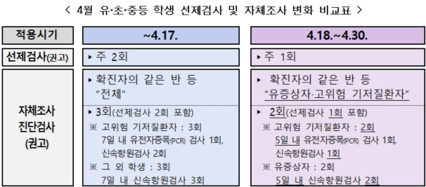 “다만, 학교‧가정의 방역 피로도 등을 고려하여 검사체계를 일부 완화하고, 5월 이후부터는 방역당국의 방역지침 변화 등에 따라 학교방역 지침도 추가적으로 보완하여 안내할 계획이다.”라고 밝혔다.