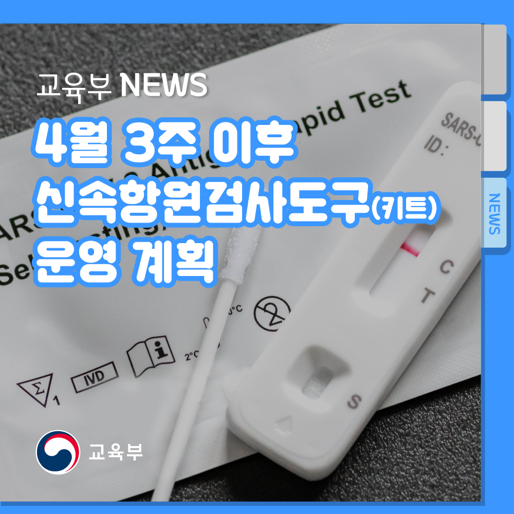 교육부(부총리 겸 교육부장관 유은혜)는 4월 3주(4.18.~)부터 그동안 유‧초‧중등 학생을 대상으로 신속항원검사도구(키트)(이하 “검사도구”)를 활용하여 주 2회 실시하던 선제검사는 주 1회를 원칙으로 하되(교직원은 기존 주 1회 검사 유지), 시도교육감이 탄력적으로 운영*할 수 있도록 하고,
