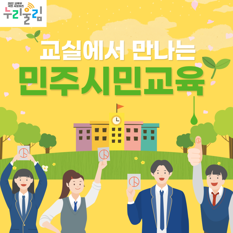 지금까지 교육 현장에서 이루어지고 있는 민주시민교육에 대해 살펴보았는데요, 민주시민교육은 배움의 주체인 학생이 스스로 사회 현상을 비판적으로 바라보고 판단할 수 있도록 돕는 역할을 해야 할 것입니다. 학교라는 공동체를 구성하는 교사, 학생, 학부모와 더불어 지역 사회가 함께 민주시민교육에 대해 고민하며 민주시민교육의 발판을 더욱 공고히 만들어나가기를 바라봅니다.