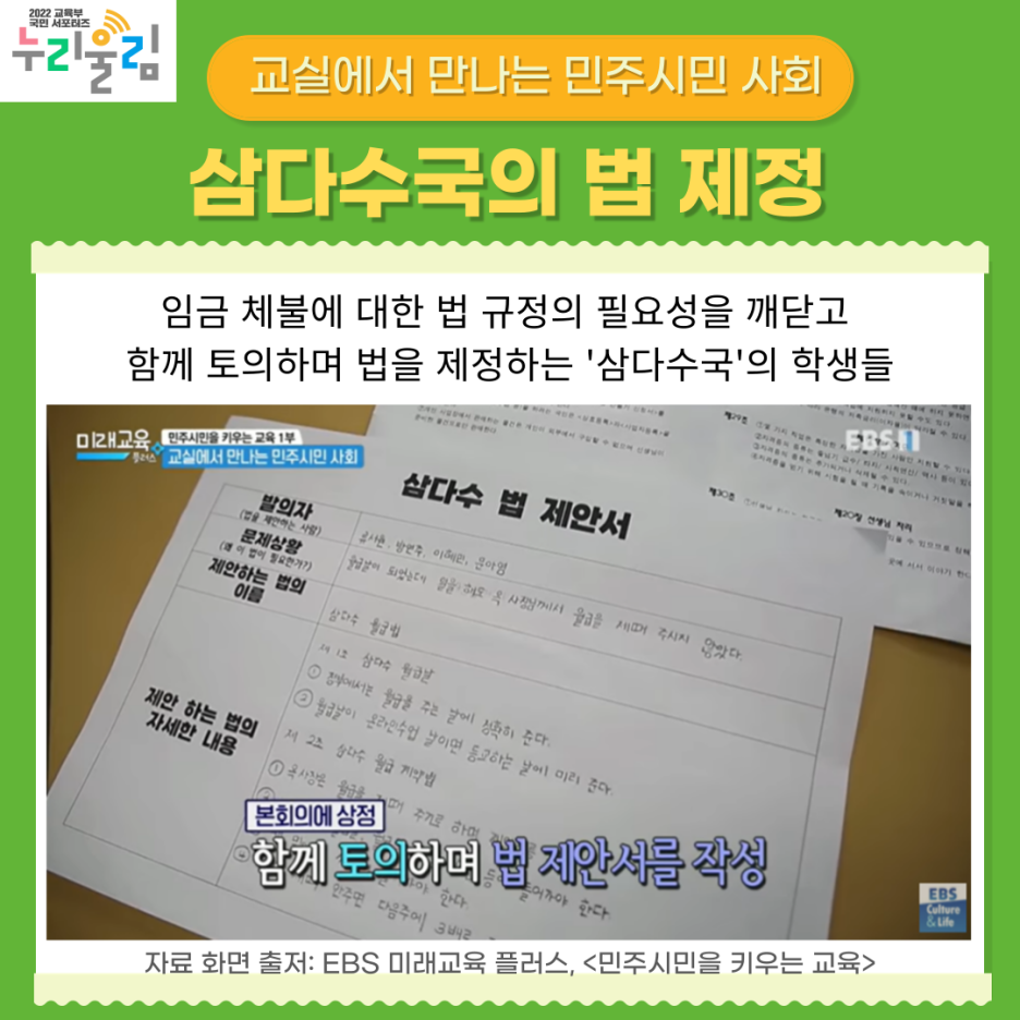 월급에 설레는 마음도 잠시, 월급 명세서를 확인한 학생들은 세금만 나가고 지급되지 않은 월급을 발견합니다. 담임 선생님으로부터 예상치 못한 임금체불 소식을 전달받은 학생들은 가계부를 작성하며 임금체불 문제의 심각성을 체감하게 됩니다. 학기 초, 삼다수국 학생들은 교실 국가 헌법을 제정했는데요. 담임 선생님은 임금체불에 대한 규정을 만들지 않았던 법의 허점을 찌른 것이죠.
