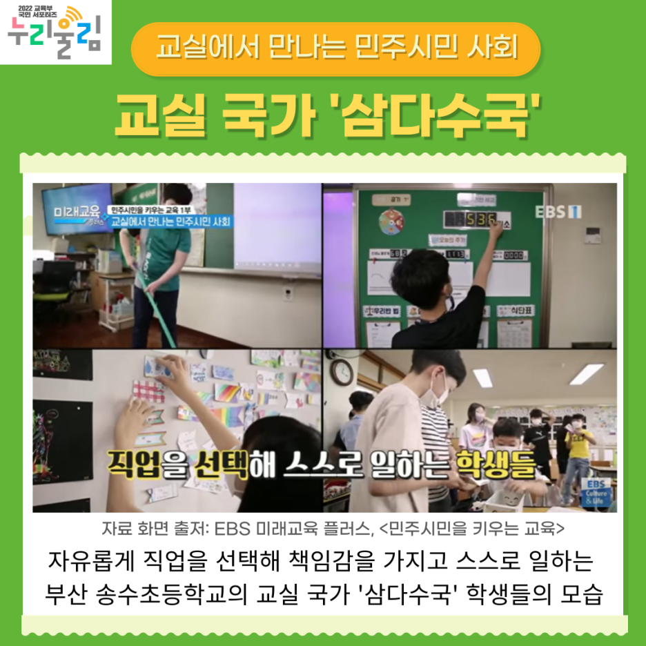 학급이 하나의 국가가 되었다는 부산의 송수초등학교 5학년 한 학급. 학생들은 직접 교실 국가의 이름을 ‘삼다수국’이라고 정했습니다. 삼다수국에서는 학급구성원 모두가 지켜야 하는 규칙이 있습니다. 바로 ‘모두 직업을 가져야 한다’는 규칙입니다!