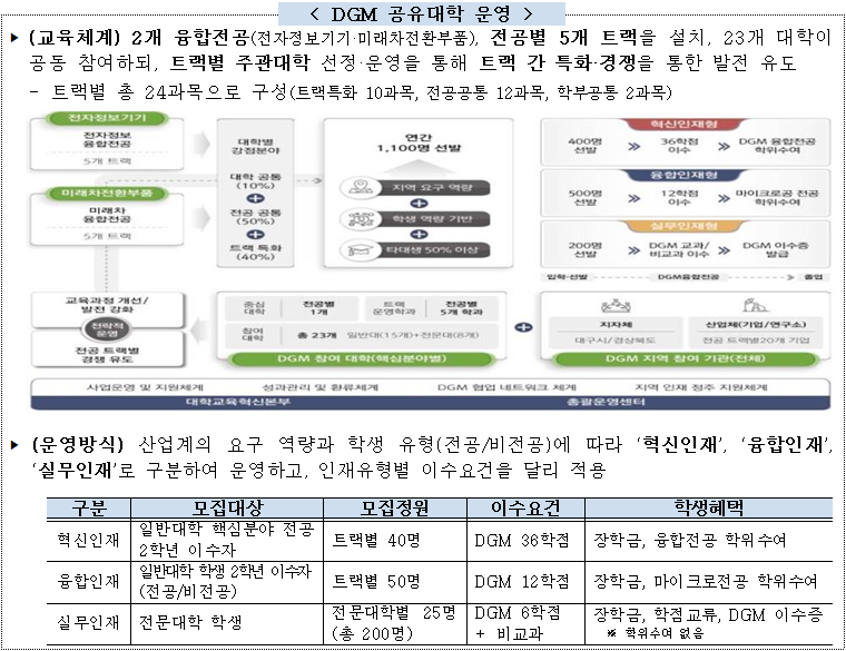 대구·경북 플랫폼은 2개 융합전공에 전공별 5개 트랙을 갖추고 트랙 간 특화와 경쟁을 통해 발전해나가는 ‘DGM 공유대학*(참여대학 23개)’을 구축·추진할 예정이다.