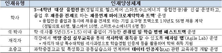 고교학점제 연계과정(초중고), 채용연계 마이크로계약학과 트랙(학사), 애자일 랩(재직자) 등 초·중등에서 재직자 단계까지 인재유형별 프로그램을 운영하여 지역기업 등이 필요로 하는 인재양성체계를 구축할 예정이다.