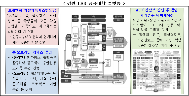 강원 플랫폼은 데이터 기반 역량을 갖춘 인재양성을 위해 초개인화 학습기록시스템(LRS)*, 인공지능(AI) 사전탐색 진단 취·창업 지역정주 내비게이션을 기반으로 온·오프라인 운영이 결합된 ‘강원 LRS 공유대학 플랫폼’(참여대학 15개)을 구축할 예정이다.