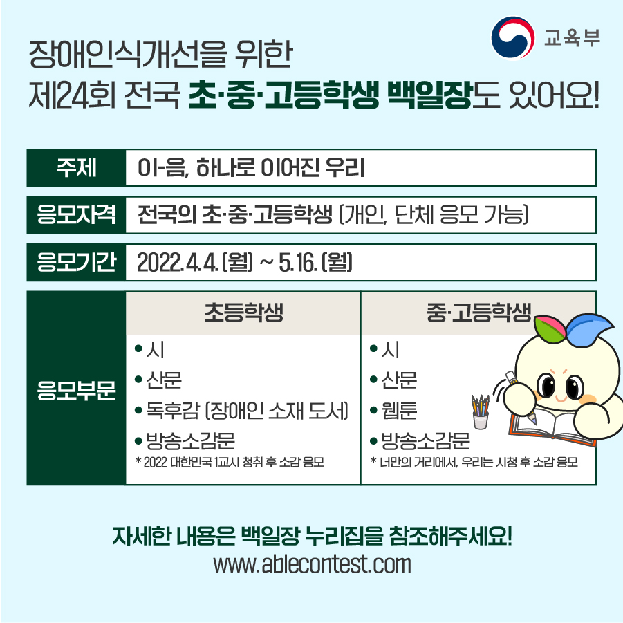 #교육부 #장애인의날 #장애인식개선 #장애이해교육 #유치원생 #초등학생 #중고등학생 #모두의놀이터 #백일장 #장애인먼저실천운동본부 #KBS #삼성화재 #사랑의열매