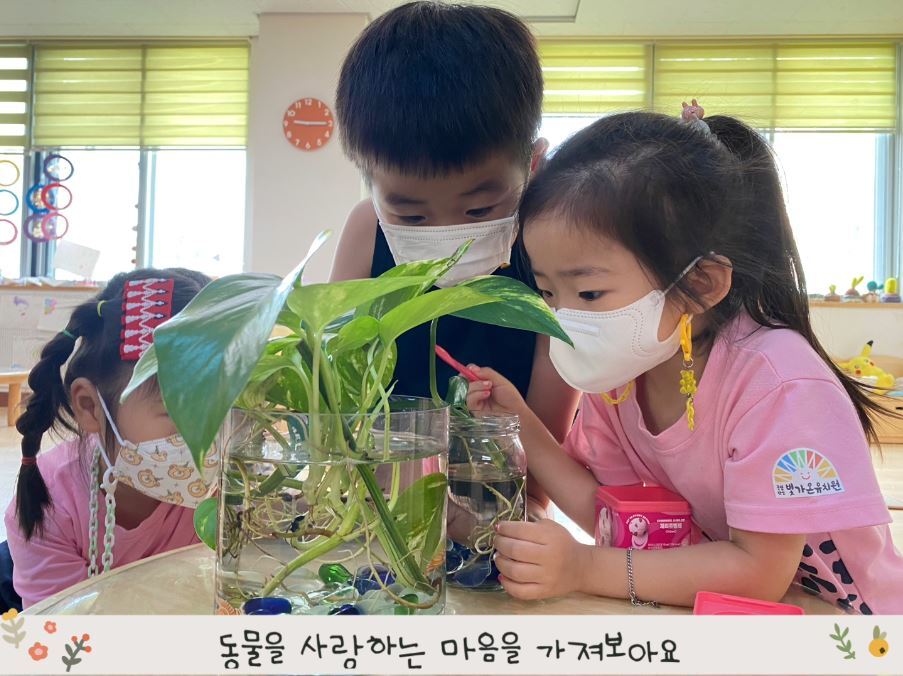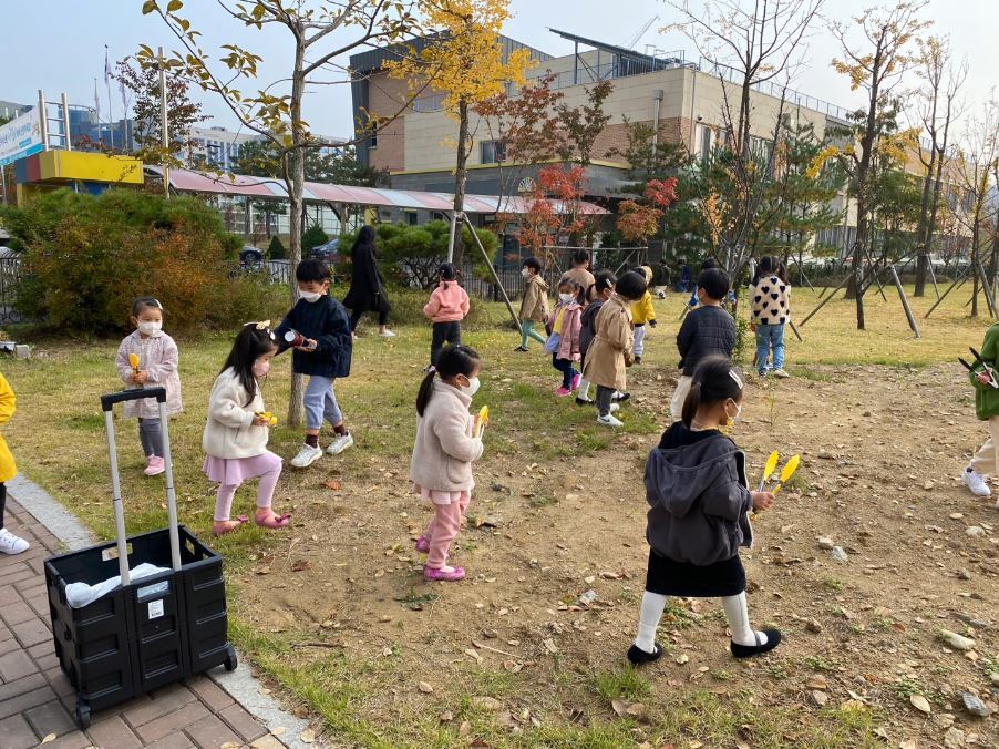 계절마다 만나는 꽃, 나뭇잎, 곤충 등에 관심이 많습니다. 공원 산책을 나가서 자신의 발 아래 있는 꽃을 발견하고 한참을 앉아 관찰하기도 하고 어느 날 꽃과 풀이 아닌 쓰레기가 많아진 것을 발견하면 “왜 여기 있어?”라고 궁금증을 가지며 “우리가 줍자”라고 말하기도 합니다. 부모님과 함께 등원길을 걸어오면 떨어진 나뭇잎과 꽃잎을 주워와 선생님에게 선물하며 인사를 건네기도 합니다. 하늘을 올려다보고 “오늘 바깥놀이 나갈 수 있어요? 미세먼지 좋음이에요?”라고 묻기도 하죠. 자신의 주변 환경을 살펴보고 돌아보는 것이 작지만 가장 큰 변화이지 않을까 싶습니다.