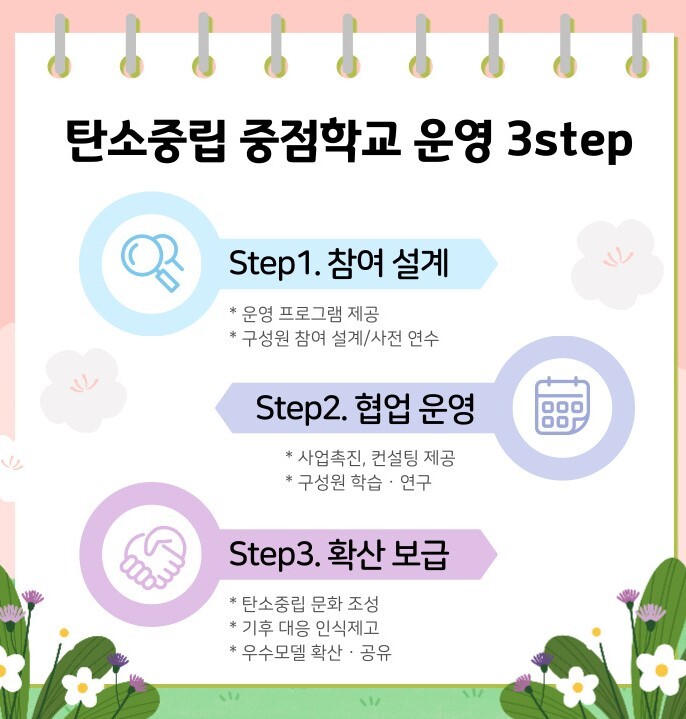 탄소중립 중점학교는 환경 미래세대인 학생들에게 행동하는 생태 감수성을 심어줄 환경 지혜 교육의 종합 프로그램입니다. 교실 숲, 생태 탐방로 등 물리적인 환경을 구축하는 데 그쳐서는 절대 안 됩니다. 물리적인 환경과 함께 학생들이 지구 생태 환경을 위해 스스로 행동할 수 있는 환경 지혜를 습득할 수 있는 의미 교육이 반드시 병행되어야 합니다. 6개 정부 기관에서 공동으로 수행하는 국가적인 사업인 만큼 생태 집단 지성을 발휘할 수 있는 큰 이점이 있는 사업입니다. 그 지성을 실천할 수 있는 곳이 바로 학교라고 생각합니다.