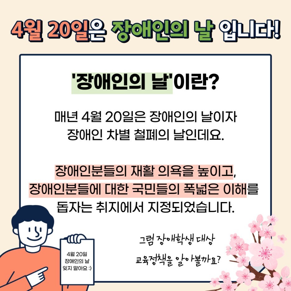 매년 4월 20일 장애인의 날 역시 기억해 주시고, 교육부 정책이 올해와는 또 어떤 점이 달라졌을지 기대하며 많은 관심 부탁드립니다!
