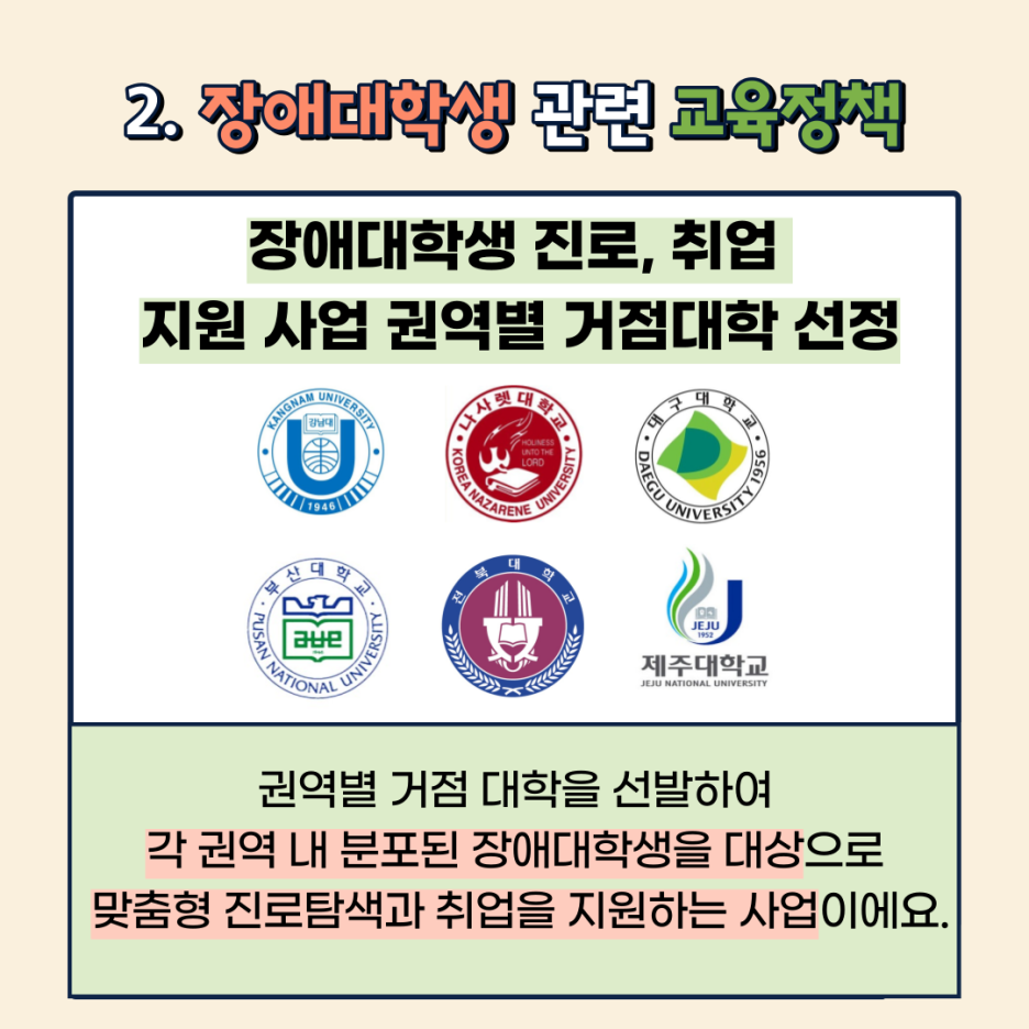 이러한 교육정책을 통해 각 권역 내 분포된 장애대학생들이 권역별 거점대학에서 진로탐색과 취업에 도움이 되는 양질의 교육을 받을 수 있음이 기대됩니다!