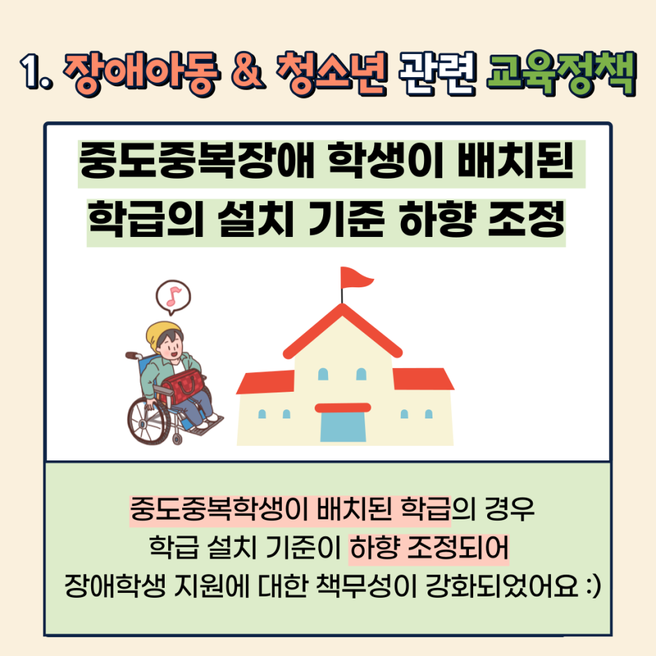 작년 12월, 특수교육법이 개정되며 중도중복장애학생들이 배치된 학급의 학급 설치 기준이 낮게 조정되면서 장애학생들에 대한 교육 환경이 개선되었답니다. 이 밖에도 장애 조기 발견과 치료, 재활 서비스를 확대하고, 장애 아동별 맞춤형 서비스를 제공한다고 해요!