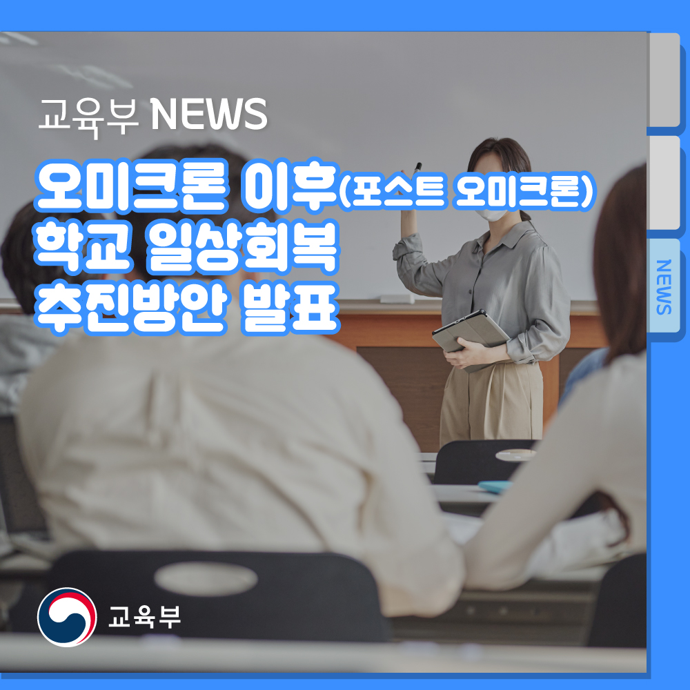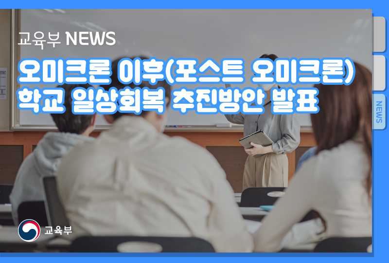 교육부(부총리 겸 교육부장관 유은혜)는 ‘오미크론 이후(포스트 오미크론) 유·초·중등 및 특수학교와 대학의 학교 일상회복 추진방안’을 4월 20일(수) 발표하였다.