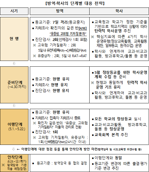 교육부는 안정적인 방역 및 학사운영 체계 전환을 위해 준비단계(4.21.~4.30.)–이행단계(5.1.~5.22.)–안착단계(5.23.(잠정)~1학기)를 거쳐 교육활동을 정상화한다.