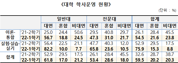 대학 또한 작년 2학기 대비 대면수업 비율이 2배가량 증가(32.6%→59.5%, +26.9%p)하는 등 철저한 방역체계에 기반하여 대면교육을 적극 확대하였고,특히 실험·실습·실기수업에서 대면수업 운영비율이 75.9%로 높게 나타났다.