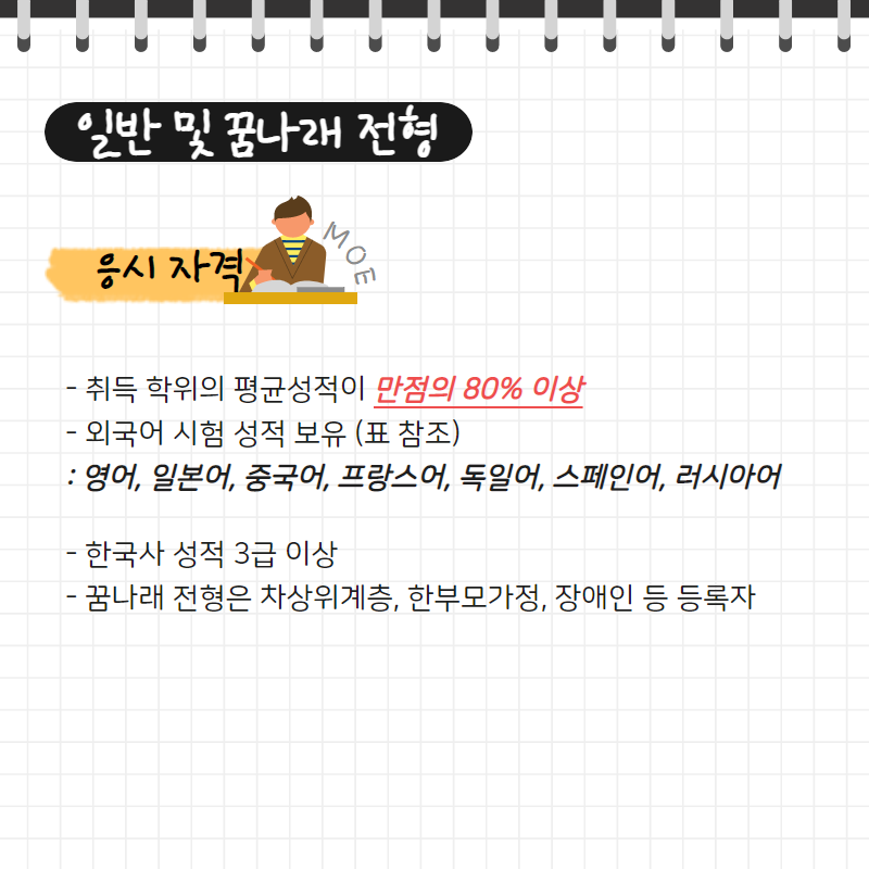 마지막으로 꿈나래 전형은 위와 같은 조건 외에 국민기초생활보장법에 따른 차상위계층, 한부모가족지원법에 해당하는 자, 장애인복지법에 장애인으로 등록된 사람만 응시할 수 있습니다. 본인이 꿈나래 전형에 해당한다면 공고일 이후 발급받은 서류로 반드시 본인이 해당자임을 증명해야 합니다.