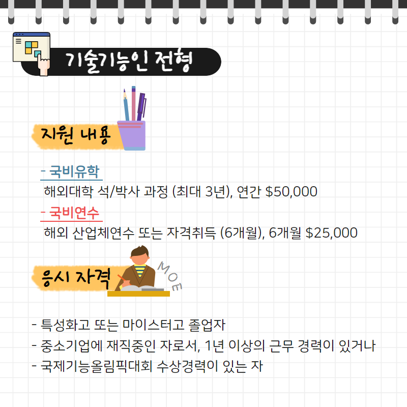 기술기능인 전형은 말 그대로 기술과 관련된 진로를 준비했거나, 실제 근무 경험이 있다면 지원할 수 있습니다. 특성화고 또는 마이스터고를 졸업했거나, 중소기업에 재직해 1년 이상의 근무 경력이 있다면 기술기능인 전형에 응시할 수 있습니다.