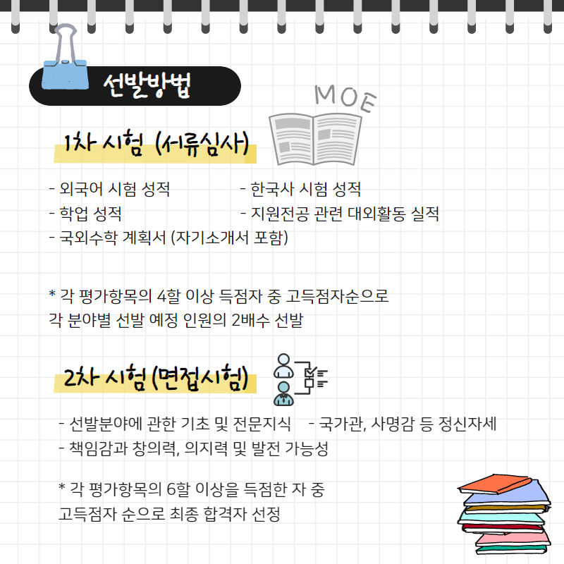 이 외에도 평소 관심이 있던 외국어를 선택해 기준점수 이상의 우수한 성적을 거둔다면 국비유학생이 될 수 있습니다. 영어, 일본어, 중국어 등 해당하는 시험 종류가 굉장히 다양하고, 기준점수도 전부 다르니, 관련 정보를 잘 확인하고 구체적인 계획을 세운다면 좋은 결과를 얻을 수 있을 것입니다.