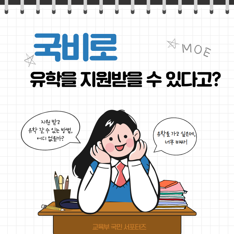 하지만 모두 금전적인 부분에서는 걱정이 많았다고 하더라고요. 사실 유학은 시간을 비롯해 비용, 정보 등 한 번 준비하는 데에 굉장히 힘이 드는데요! 그래서 준비해보았습니다, 오늘 소개해드릴 주제는 바로 ‘국비유학 프로그램’입니다. 들어보신 분도 계시고 아니신 분도 계실 것 같은데요. 지금 바로 시작해볼게요!