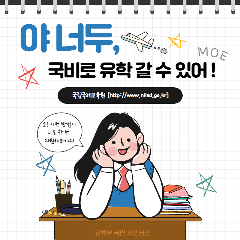 먼저 국비유학생이 어떤 프로그램인지에 대해서 알아보도록 할게요! 국비유학생 프로그램은 국립국제교육원에서 대한민국 국적자를 대상으로 외국 유학 및 연수를 지원하는 국가 장학제도입니다. 많은 유학생들이 유학 생활을 하며 발생하는 모든 의식주 비용(숙박, 교통, 책, 음식 등)은 큰 부담을 느끼는데, 국비유학생 프로그램을 통해 이를 해결할 수 있다면 정말 큰 도움이 되겠죠?