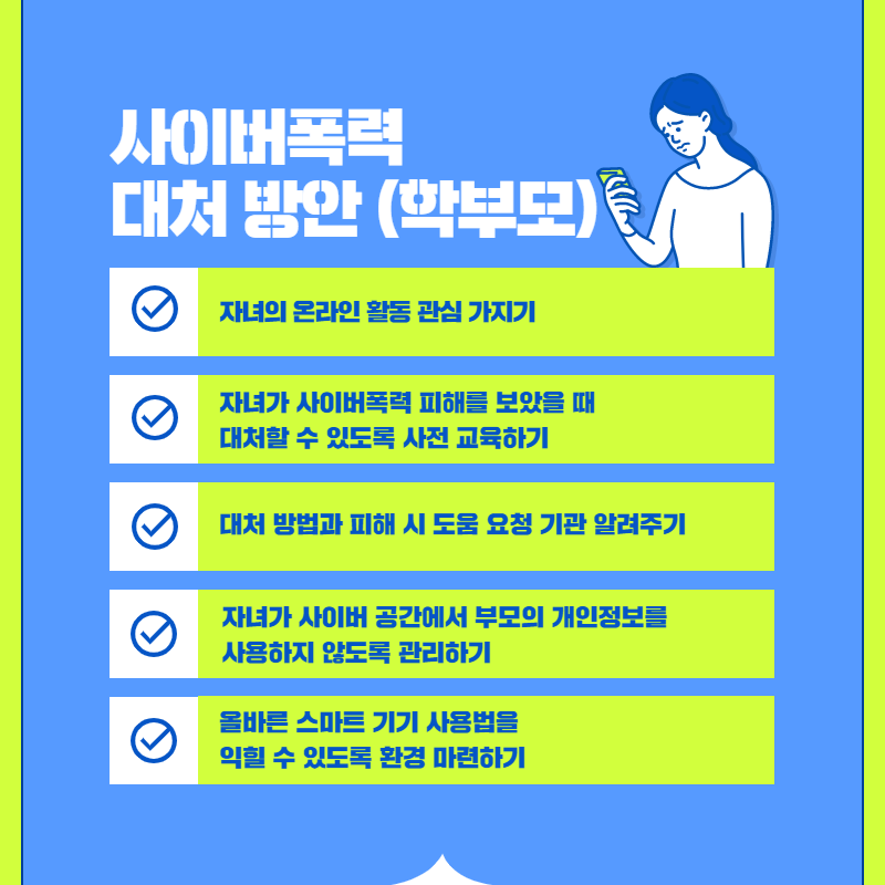 부모님 역시 사이버폭력으로부터 자녀를 보호할 수 있도록 항상 관심을 가져야 합니다. 자녀가 사이버폭력 피해를 봤을 때 보호자나 학교 선생님과 적극적으로 상의하고 도움을 받을 수 있도록 미리 사전 교육을 해야 합니다. 또한, 자녀와의 대화를 통해 사이버폭력에 대해 주기적으로 이야기를 나누고 사이버폭력 발생 시 대처 방법과 피해 시 도움 요청 기관에 대해서도 알려주는 것이 도움이 된다고 하니 활용해보는 것도 좋은 방법이라고 생각합니다. 저는 부모와 자녀의 의사소통이 가장 중요하다고 생각합니다. 학생들이 사이버폭력을 당했을 때 부모님을 믿고 도움을 요청할 수 있도록 자녀와의 대화가 중요하니 자녀와 대화를 이어갈 수 있도록 노력해보는 것은 어떨까요?