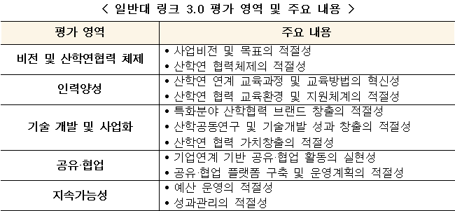 일반대 링크 3.0은 1~2단계 링크 사업의 성과를 지속적으로 고도화하고 대학과 산업계가 상생 발전하는 산학연협력 생태계를 조성하기 위해 추진되는 대학 산학연협력 종합 지원 사업이다.