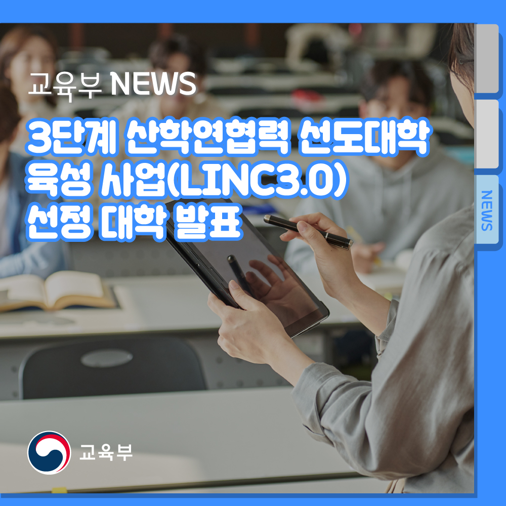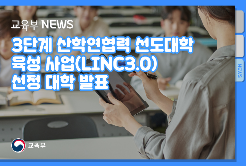 교육부(부총리 겸 교육부장관 유은혜)와 한국연구재단(이사장 이광복)은 4월 28일(목) 3단계 산학연협력 선도대학 육성사업(이하 일반대 링크 3.0) 선정 대학을 발표한다.