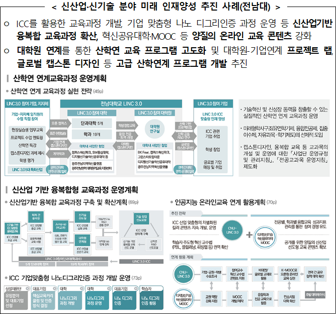 우선 신산업·신기술 분야 인재양성을 위해 산업계 수요 기반 교육과정 및 융·복합 교육과정을 활성화하고, 산학연계 공동연구 등을 확대하여 학생들이 신산업·신기술 분야의 역량 및 경험을 쌓을 수 있도록 적극 지원할 계획이다.