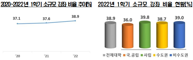 2022년 1학기 20명 이하의 소규모 강좌 비율은 38.9%로 2021년 1학기(37.6%)보다 1.3%p 상승했다.