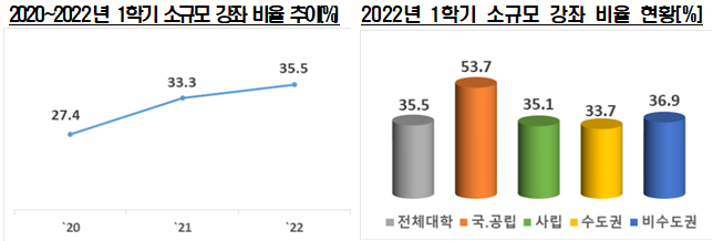 2022년 1학기 20명 이하의 소규모 강좌 비율은 35.5%로 2021년 1학기(33.3%)보다 2.2%p 상승했다.