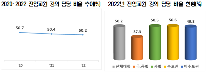 2022년 1학기 전임교원 강의 담당 비율은 50.2%로 2021년 1학기(50.4%)보다 0.2%p 하락했다.