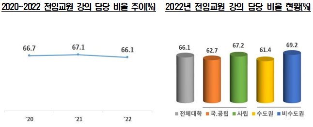 - 설립 유형별*로는 사립대학의 전임교원 강의 담당 비율이 67.2%로, 국공립대학(62.7%)보다 4.5%p 높았다.