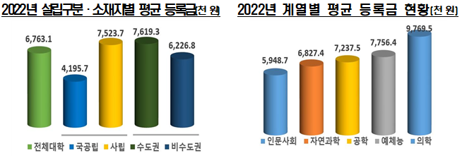 - 계열별 평균등록금은 의학(9,769.5천원), 예체능(7,756.4천원), 공학(7,237.5천원), 자연과학(6,827.4천원), 인문사회(5,948.7천원) 순이다.