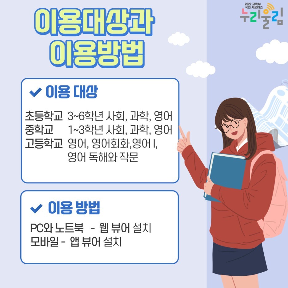 이러한 풍부한 자료와 다양한 체험을 제공하는 디지털교과서는 초등학교, 중학교, 고등학교 학생들에게 제공되며 사회, 과학, 영어 과목에 집중하고 있습니다. 그리고 PC와 노트북 심지어 모바일에서도 가능한데요! 각각 웹 뷰어와 앱 뷰어를 설치하여 실행할 수 있습니다. 스마트폰으로도 다양한 기능을 활용하는 것이 가능하다는 점이 특히 편리하고 좋은 것 같습니다!