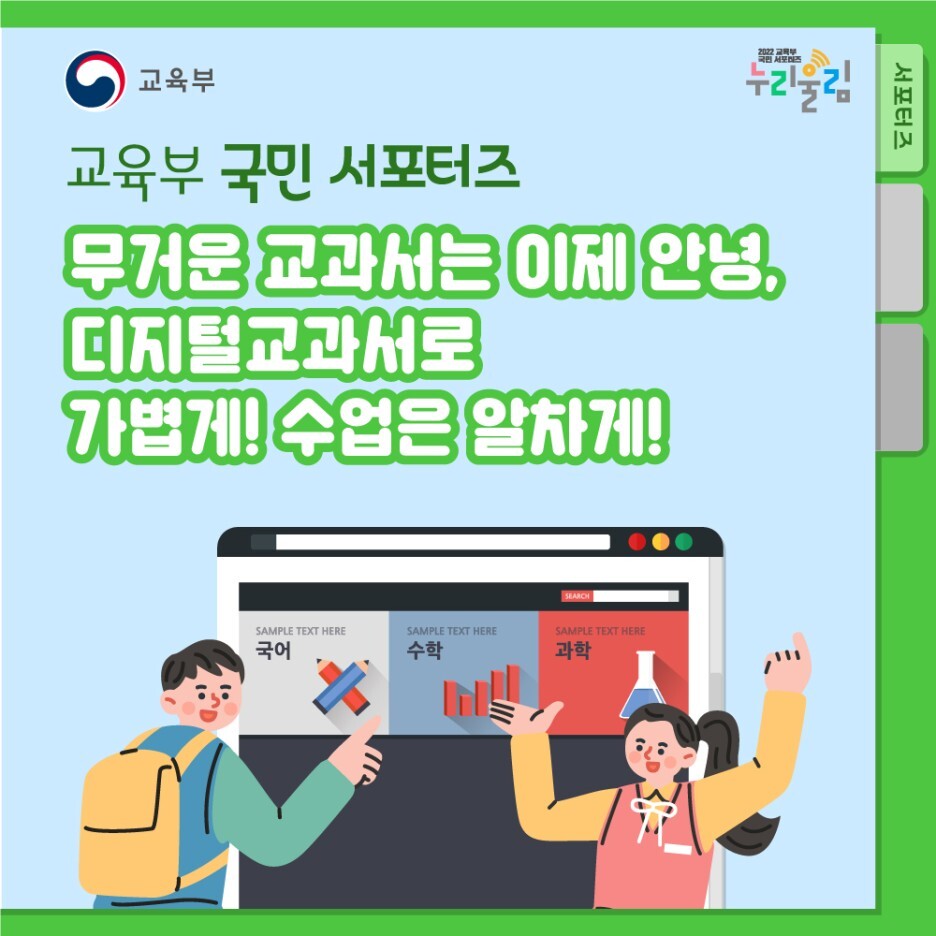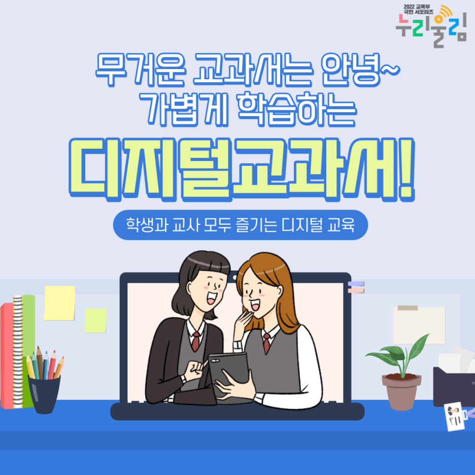 디지털교과서, 가볍지만 가볍지 않습니다. 무거운 교과서는 넣어두고 디지털교과서로 더 다양하고 넓은 세상을 만나보는 것은 어떨까요? 학생과 교사 모두가 즐길 수 있는 재미있는 수업 환경을 만들기 위해 교육부와 디지털교과서가 노력하고 있습니다. 디지털교과서의 긍정적인 미래를 함께 그려주세요!