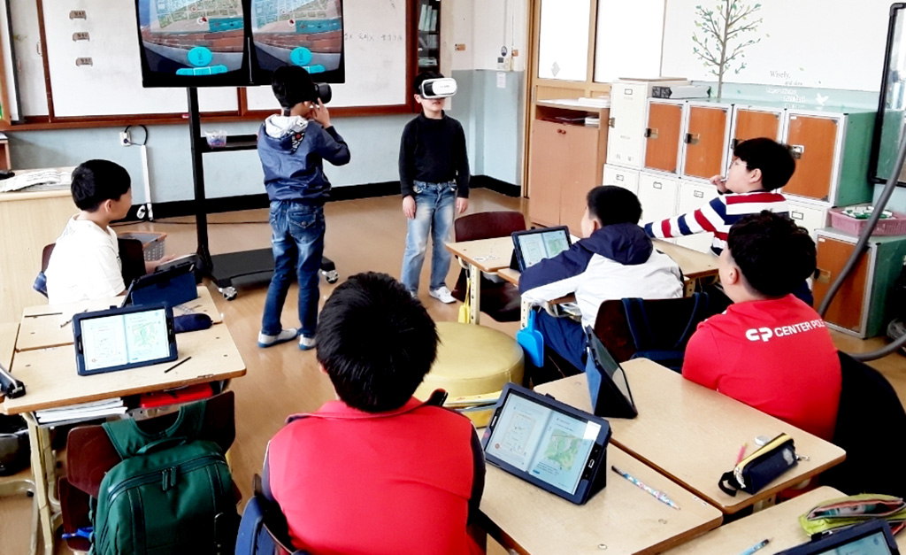 디지털교과서의 연계 실감형 콘텐츠는 학생들의 진로교육, 안전교육에도 유용하게 활용되고 있습니다. 물놀이 안전이나 지진 비상대피 등의 안전교육은 말로만 설명하는 것보다 실감 나는 콘텐츠를 활용하여 교육하는 것이 훨씬 효과적이잖아요? VR을 이용해 대피훈련을 체험해보면 더욱 기억이 잘 남고 아이들의 집중력도 높아질 수 있을 것 같습니다!