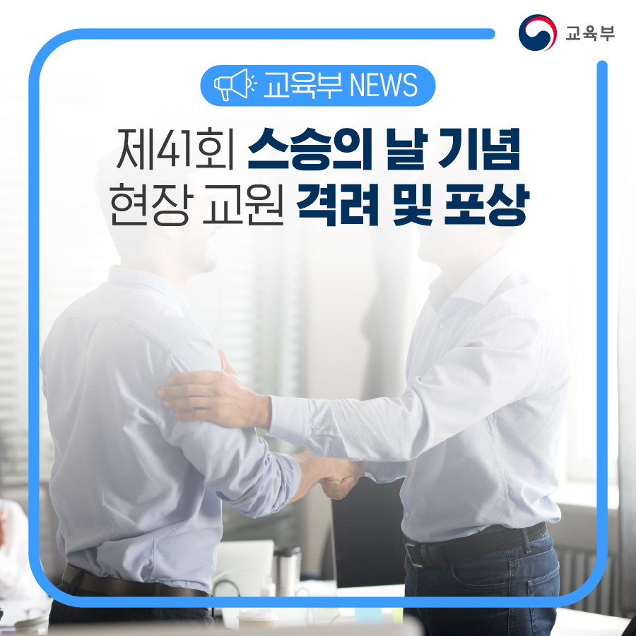 교육부는 제41회 스승의 날을 맞이하여 교육 현장에서 헌신하는 교원들을 격려하고자, 사명감을 가지고 솔선수범하는 유공 교원 3,182명*에게 정부포상과 표창을 수여한다.